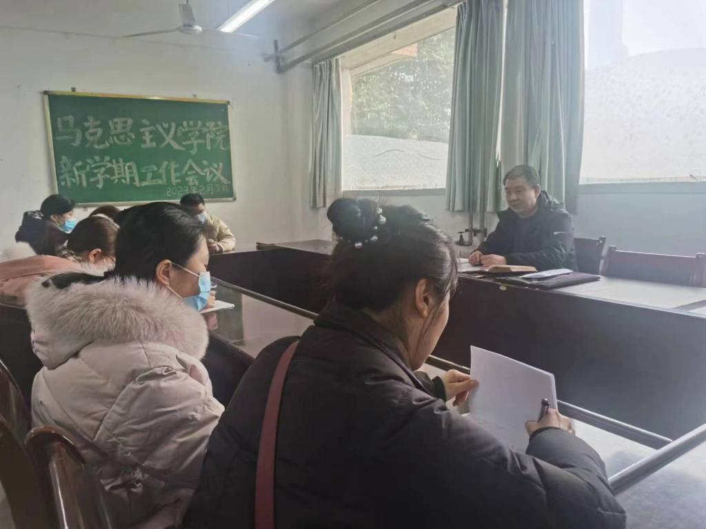 会上,院长孟昭阳首先传达了学校2023年春季开学准备暨安全稳定工作专题会议精神,并对新学期Beat365中文官方网站的工作目标及主要工作任务进行了安排部署。孟昭阳强调:新的学期,要严格按照中央《关于加强新时代Beat365中文官方网站建设的意见》和教育部《Beat365中文官方网站建设标准》要求,锚定创建河南省高等学校示范性Beat365中文官方网站目标,认真对标对表,不断加强思政课教师队伍建设,推进思政课改革创新,落实好“六大主要任务”,促进教育教学、理论宣传、人才培养、队伍建设工作取得新进展。一要以全面学习宣传党的二十大精神,扎实推进习近平新时代中国特色社会主义思想的“三进”工作为首要任务,用党的最新理论创新成果铸魂育人;二要以落实中央《关于关于加强新时代Beat365中文官方网站建设的意见》和教育部《高等学校思想政治理论课建设标准》(2021本)等文件精神,深化新时代思政课改革创新为中心,打造示范课堂,推进思政“金课”建设;三是要以教师教学能力大赛和“大练兵、大比武、大展示”活动为抓手,不断提升教师教学能力;四是以部校共建习近平新时代中国特色社会主义思想研习中心为依托,组织理论骨干深入研究、阐释党的二十大提出的新思想新观点;五是以推进党建与教育教学工作深度融合为重点,加强Beat365中文官方网站党的建设;六是以河南省普通高等学校心理健康教育工作标准化建设验收为契机,全面提升Beat365官网心理健康教育水平。