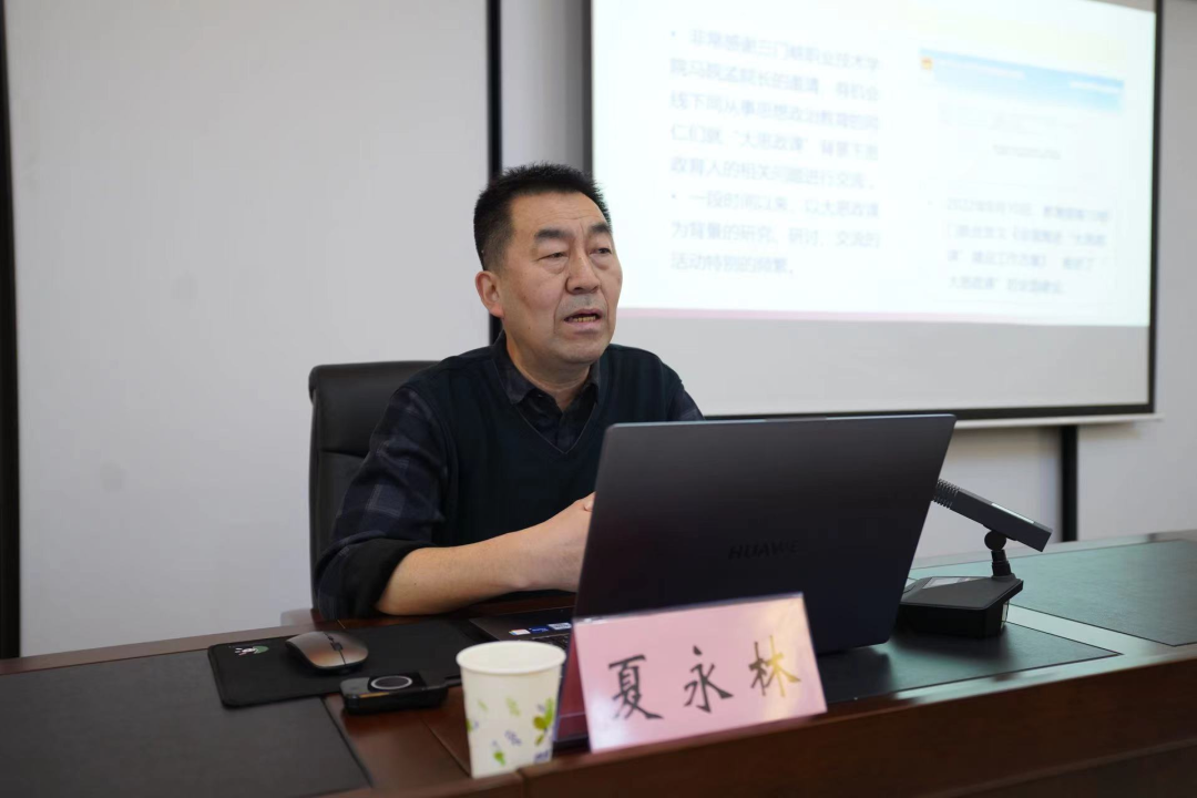 西安电子科技大学Beat365中文官方网站夏永林教授以《以“大思政课”理念推进思政育人的思考》为题,从“大思政课”的提出、“大思政课”多维内涵及思政育人理念、“大思政课”背景下思政协同育人思考三个方面进行了详实而生动的讲解。报告主题明、视角新,具有很强的针对性和实操性,以“大思政课”的提出背景为切入,通过“育人理念”“育人体系”“育人过程”“育人主体”“育人格局”五个维度全面诠释解读了“大思政课”的内涵和育人机制,紧扣推进“大思政课”需破解的难题,提出以“大思政课”理念与思维,统筹协调思政育人的多主体、多平台、多资源、多方式、多手段,善用社会“大课堂”、搭建“大资源”平台、构建“大师资”体系、建设工作“大格局”,切实推动高职院校思政育人提质增效。