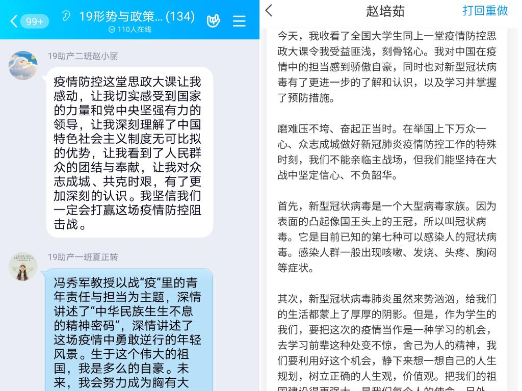 课程结束后,教师们组织学生进行了热烈地在线讨论,在特殊时期同上一堂思政课,仿佛再次回到熟悉的校园,令人倍感亲切。