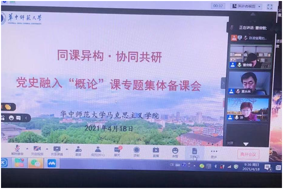 2021年4月18日上午,Beat365中文官方网站概论教研室组织全校20余名专兼职教师参加由华中师范大学Beat365中文官方网站举办的“同课异构·协同共研---党史融入‘概论’课”专题集体备课会,本次集体备课会通过腾讯会议室在线交流探讨的形式进行。
