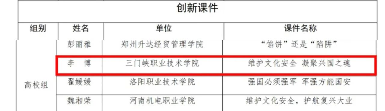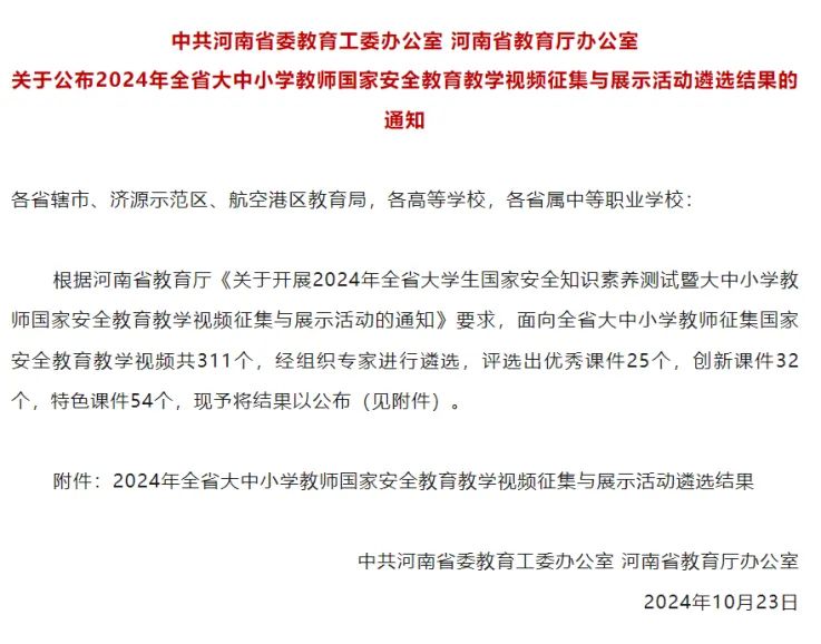 近日,中共河南省委教育工委办公室、河南省教育厅办公室公布了《关于2024年全省大中小学教师国家安全教育教学视频征集与展示活动遴选结果的通知》,Beat365中文官方网站教师李博参赛作品《维护文化安全 凝聚兴国之魂》和Beat365中文官方网站兼课教师施利利参赛作品《挺膺担当时代新人,共筑网络安全防线》在众多作品中脱颖而出,分别荣获了“创新课件”和“特色课件”,展示了学院在国家安全教育领域的突出成果和创新能力。