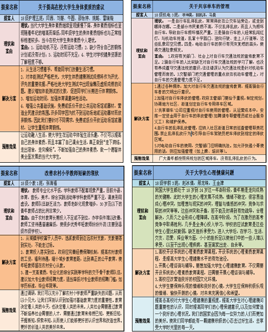 此次模拟两会活动,从5月25日-6月5日,历时近半个月的时间,经过前期的提案征集、提案初选和报告展示三个环节,最终评选了10份优秀且有代表性的提案。报告展示以学生录制视频、音频等形式进行。在报告展示中,各小组代表具体展示了各自的提案案由、解决方案等内容。提案内容广泛,涉及多个领域,包括提高在校大学生身体素质的建议、加强共享单车管理、改善农村小学教师短缺现状、加强大学生心理健康教育、提高学前教育从业教师的薪资待遇、促进大学生就业、加强农村垃圾分类管理、建议网络主播持合格证上岗等多个问题。各小组提案均能以小见大,结合具体案例,深入分析提案的合理性和可行性,充分体现了青年学生善于发现生活、关心生活的问题意识。