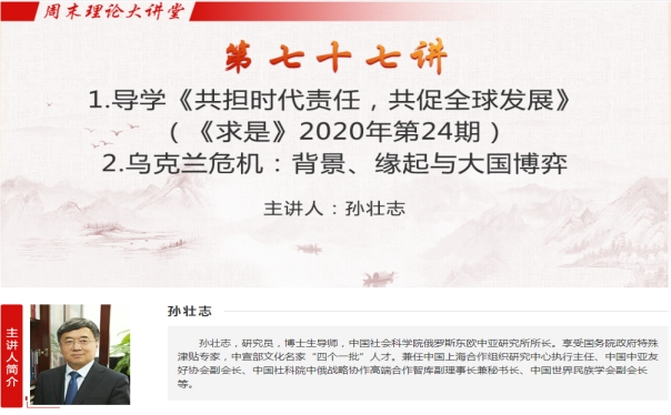 首先,孙壮志教授领学了习近平总书记的重要文章《共担时代责任,共促全球发展》(《求是》2020年第24期),他表示,习近平总书记深刻分析了经济全球化时代世界面临的问题与挑战,深入阐释了产生问题的诸多原因,提出了破解难题的中国态度和中国方案,为明晰当前的乌克兰局势提供了根本的政治立场和理论遵循。