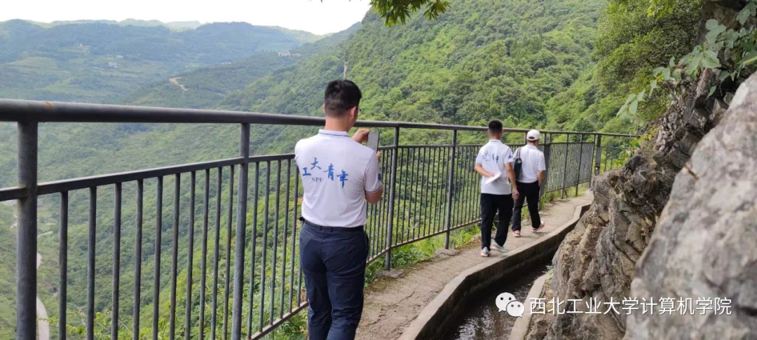 实践队一行人来到大发天渠,感受黄大发老支书带领村民修渠的艰辛,学习黄大发老支书踏实做事,攻坚克难的“当代愚公”精神。青山无言,大地无言,却是最厚重的史册。走在穿梭蜿蜒于悬崖峭壁上的引水渠边,我们不禁让人感叹当年黄老支书带领村民绕三重大山,过三道绝壁,穿三道险崖造渠的艰辛与不易。在修建擦耳岩段时,一处倒悬的岩壁让专业测量施工人员望而却步,然而黄老支书一马当先,在仅有一根绳子作为保护措施的条件下进行线路的测量与勘探。在天渠的开凿过程中,他身先士卒,用矮小的身板扛着锄头和钢钎,让汗水和实践映衬他伟岸挺拔的身姿,在峭壁中一寸一寸凿,一尺一尺敲,用坚毅撬开了大山的绝壁,用执着引来了幸福的水源。36年的不折不挠,终于为亘古干旱的团结村引来了一渠滋润的生命之水。三千青丝,尽付引水情,绝壁出天渠;半生辛劳,尽显英雄志,壮志临山河。