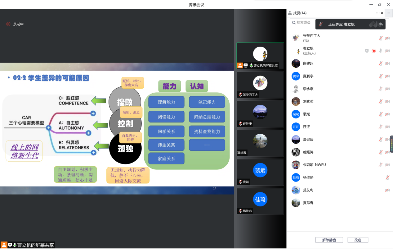 在经验分享环节,永利集团88304官网集团王云岚副教授从为师之道、学业规划、日常管理、风险管控等8个方面介绍班级管理心得,强调了因材施教、分类指导等细节管理的重要性。王云岚老师在分享中还提出,“管理好学生的最好时机是大一开学,其次是现在”,班主任老师应充分发挥自身专业优势,全面提升班级学生的专业素养及创新能力。紧接着,数学与统计学院裴斌教授作《全过程精准画像、全方位整合资源、全覆盖帮扶提升》专题分享。裴斌老师强调了坚持为党育人、为国育才的初心使命,介绍了“以学生为中心、润物细无声”的班级育人理念,提出了贯穿班级管理始终的“三航筑梦、促学笃行、强基固本、创新赋能、塑造价值”思想,