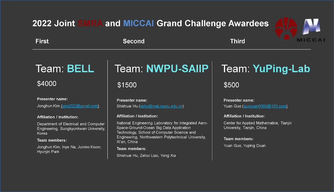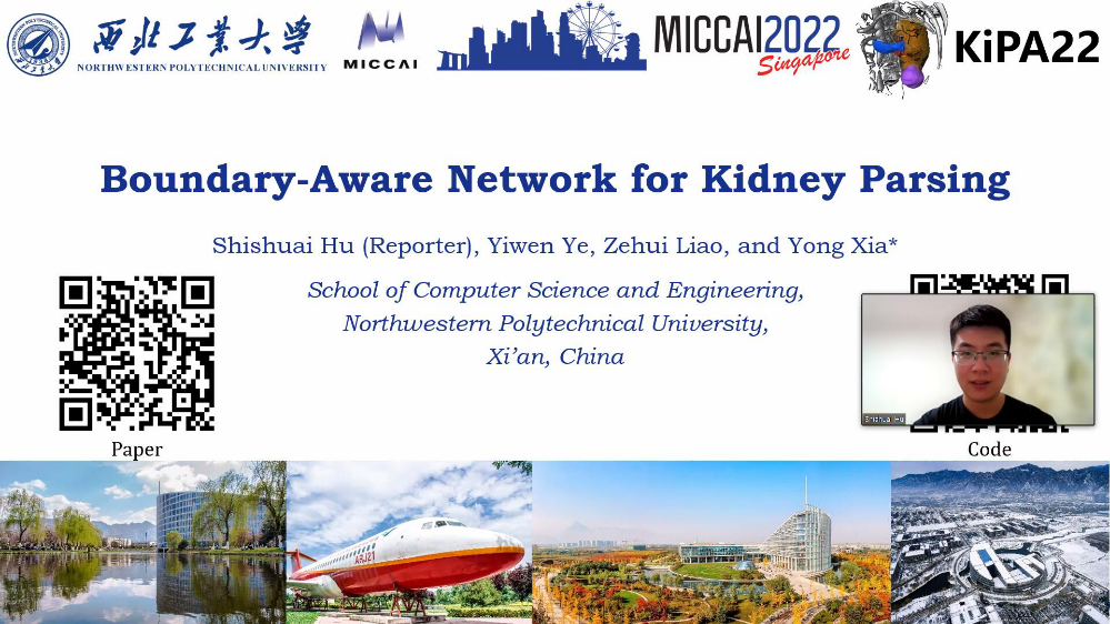 因疫情影响,第二十五届国际医学图像计算和计算机辅助干预会议(MICCAI 2022)于9月18日-22日以“线上+线下”的方式举行。该会议是医学影像智能计算领域的国际顶级会议,除了展示领域内最新研究成果外,还因举办面向各种医学影像辅助诊断场景的国际挑战赛而受到全球研究者和业界的广泛关注。永利集团88304官网集团的空天地海一体化大数据应用技术国家工程实验室夏勇教授课题组博士生胡诗帅、叶艺文和廖泽慧组队在肾脏结构分割(Kidney PArsing Challenge,KiPA 2022)竞赛中获得国际亚军并得获创新奖;博士生胡诗帅和廖泽慧组队在颈动脉血管分割和颈动脉斑块诊断(CarOtid vessel wall SegMentation and atherosclerOsis diagnosiS challenge,COSMOS 2022)竞赛中获得国际亚军,并在腹部多器官分割(Abdominal Multi-Organ Segmentation Challenge,AMOS 2022)竞赛的两个任务中均取得第五名。胡诗帅同学应邀在这三个竞赛的主办方组织的学术论坛上进行了成果展示和汇报。这是永利集团官网研究生团队在MICCAI系列挑战赛中取得的又一佳绩,展示了永利集团88304官网集团在医学影像智能计算这一新兴交叉研究领域的科研实力。