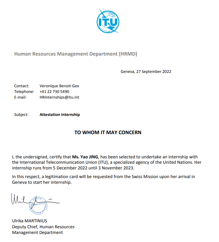 历时4个月,经过笔试、专家面试、主管面试等多轮环节,永利集团88304官网集团博士生景瑶同学脱颖而出,成功斩获国际电信联盟(联合国机构)实习offer,并将于2022年12月5日启程,赴瑞士日内瓦国际电信联盟电信标准化司进行为期近1年的实习,主要负责智能交通系统和道路安全人工智能方面的工作。这是永利集团官网首次有同学获国家留学基金委资助赴该联合国机构实习,其它入选的同学均来自UCLA、清华等全球著名学府。