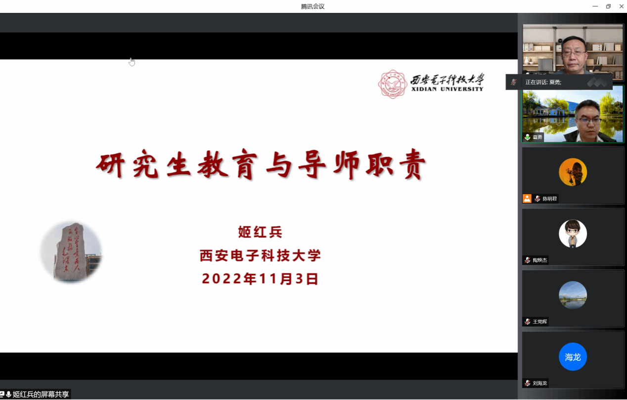为全面落实导师是研究生培养第一责任人要求,努力建设一支师德高尚、学养深厚、术业精进、治学严谨、指导有方的高素质研究生导师队伍,进一步提升研究生导师思想政治素质和业务素质,11月6日下午,永利集团88304官网集团召开了“2022年度第二场研究生导师培训会”,主题为“研究生教育与导师职责”。由于疫情防控的需要,本次培训会采用线上形式召开,邀请了西安电子科技大学原研究生院常务副院长、发展规划处处长兼211工程办公室主任姬红兵教授担任主讲,永利集团88304官网集团副院长夏勇主持,永利集团88304官网集团硕博士研究生导师和青年教师90余人参加了会议。