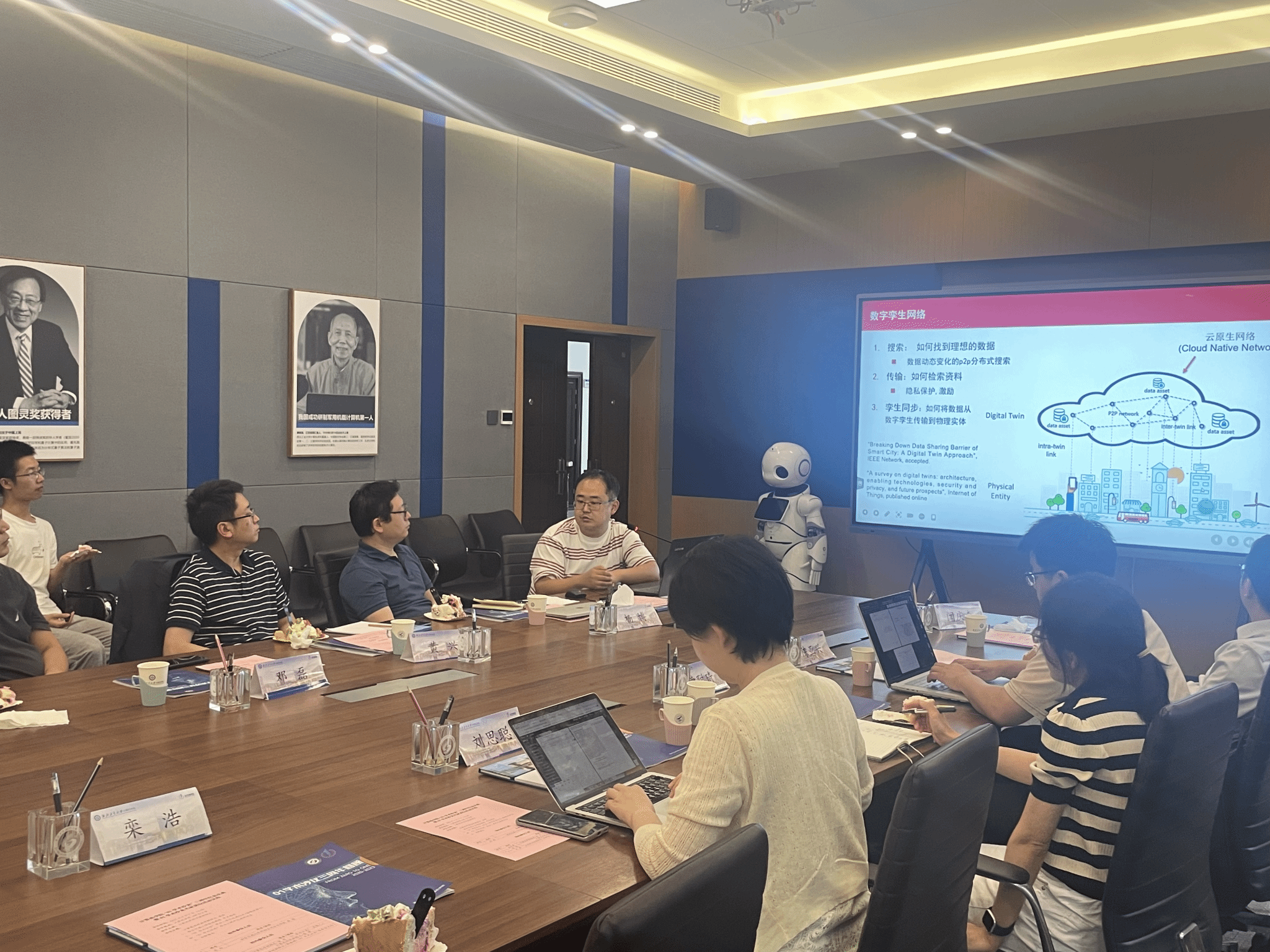 庆典仪式后,西安交通大学栾浩教授作了题为“数字孪生与元宇宙:研究与挑战”的报告,现场学术氛围专注而热烈。报告主要从数字孪生网络构建、信息分享、孪生智能等角度分享相关研究成果,并对数字孪生与元宇宙的应用场景,主要技术进行讨论。数字孪生面向未来智能系统,提供了一种“虚-实结合”的新型通信方法,但是针对这种方法,还面临着诸多机遇和挑战,这需要进一步的探索和挖掘。现场教师针对此研究方向展开了深入的交流,碰撞出了更多智慧的火花。