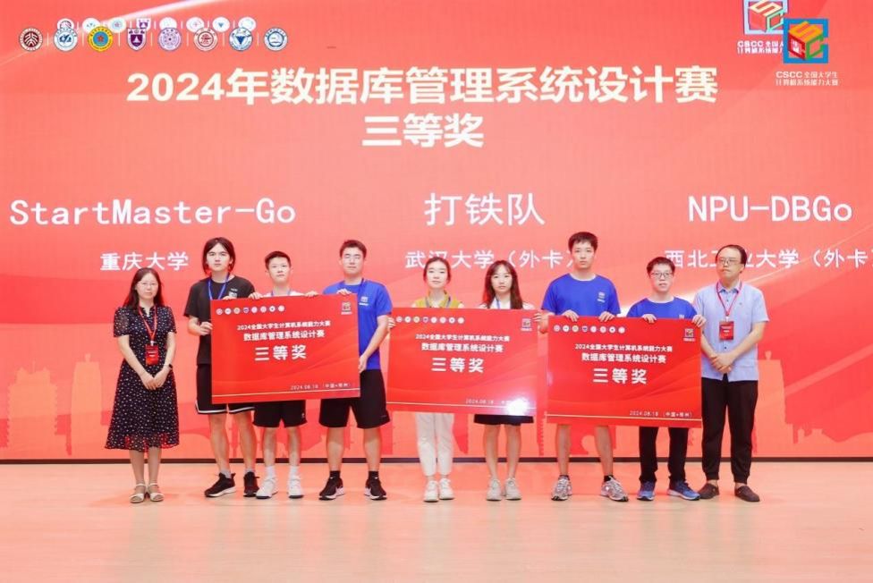 本次数据库管理系统设计赛历时2个多月,各个参赛队需要围绕数据库管理系统的内核完成10道功能题和1道性能优化赛题,赛程长,难度大。比赛过程中,各个参赛队成员紧密合作,充分发挥各自的技术特长,在学院数据库团队多位老师的指导下不断优化代码、调整算法,克服了一个又一个技术难题,最终脱颖而出,完成了一个可以运行TPC-C基准测试的小型数据库管理系统。其中,由沈阳、丁榕、张凯伦三位同学组成的“啊对对队”,以及由甘仰发、曾庆礼、王旭升三位同学组成的“对什么队”同时荣获二等奖,由白博昊、郑泽锴、杨黎健同学组成的“NPU-DBGo”队伍荣获三等奖。
