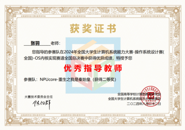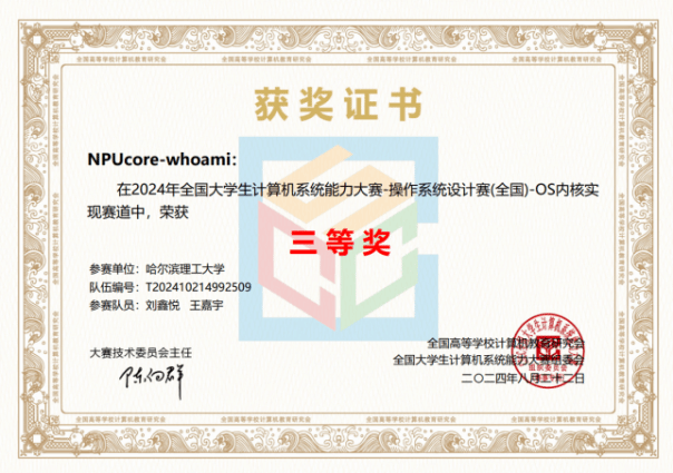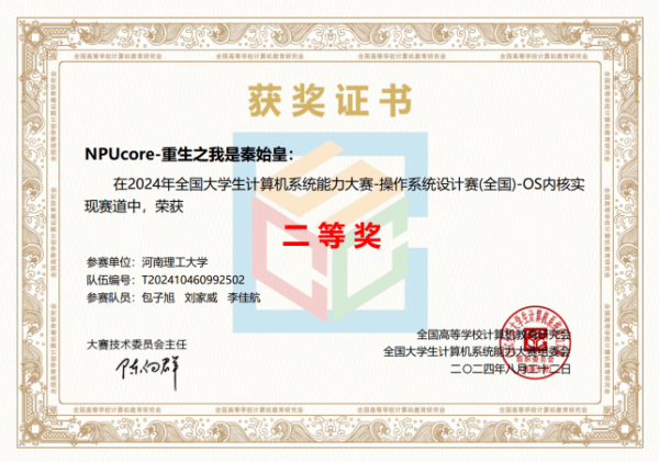 永利集团88304官网集团本科生冯宜湑与软件学院张逸飞和网安学院张瀚宸组成的“NPUcore-IMPACT!!!”队伍获得LoongArch内核实现赛道一等奖。该队伍的NPUcore-IMPACT内核使用Rust编写,基于龙芯架构支持2K1000开发板及其虚拟机,支持106个系统调用和FAT32/EXT4文件系统,并在初赛决赛取得最高分,成为该赛道唯一libc-bench得分队伍。