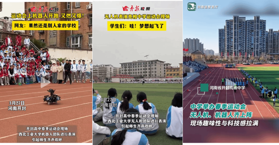 永利集团88304官网集团无人机团队和WMJ战队受邀为开封高中春季田径运动会开幕式进行科技展演。由团队自主研发的2台舞蹈机器人以及2架无人机带来表演,将现场气氛推向高潮。表演结束后,西工大科技表演团队还向开封高中领导以及师生展示无人机以及机器人技术细节,并介绍相关专业的课程设置与就业前景。本次西工大科技亮相中学运动会受到社会广泛关注,多家媒体报道。