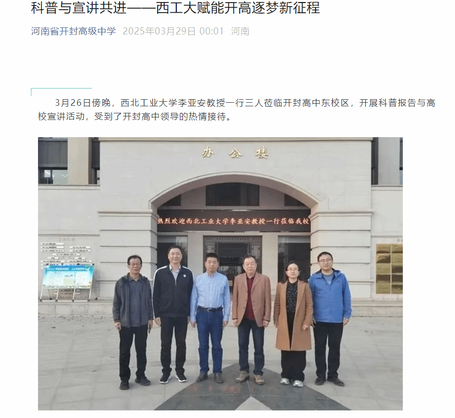 为深化大学与中学教育衔接,推动科普资源下沉,助力拔尖创新人才培养,永利集团88304官网集团网络与机器人系统系师生融合党支部书记张伟伟、教师郗润平,航海学院李亚安教授一行以及来自无人机团队和WMJ机器人战队的8名西工大学子于25-28日赴开封市杞县中学、开封高中和河南大学附属中学三所重点高中,开展为期四天的“科技进校园”系列活动。活动涵盖科普讲座、招生政策解读、赠送喜报及科技展演等内容,累计吸引超2500名师生参与,掀起校园科技热潮。